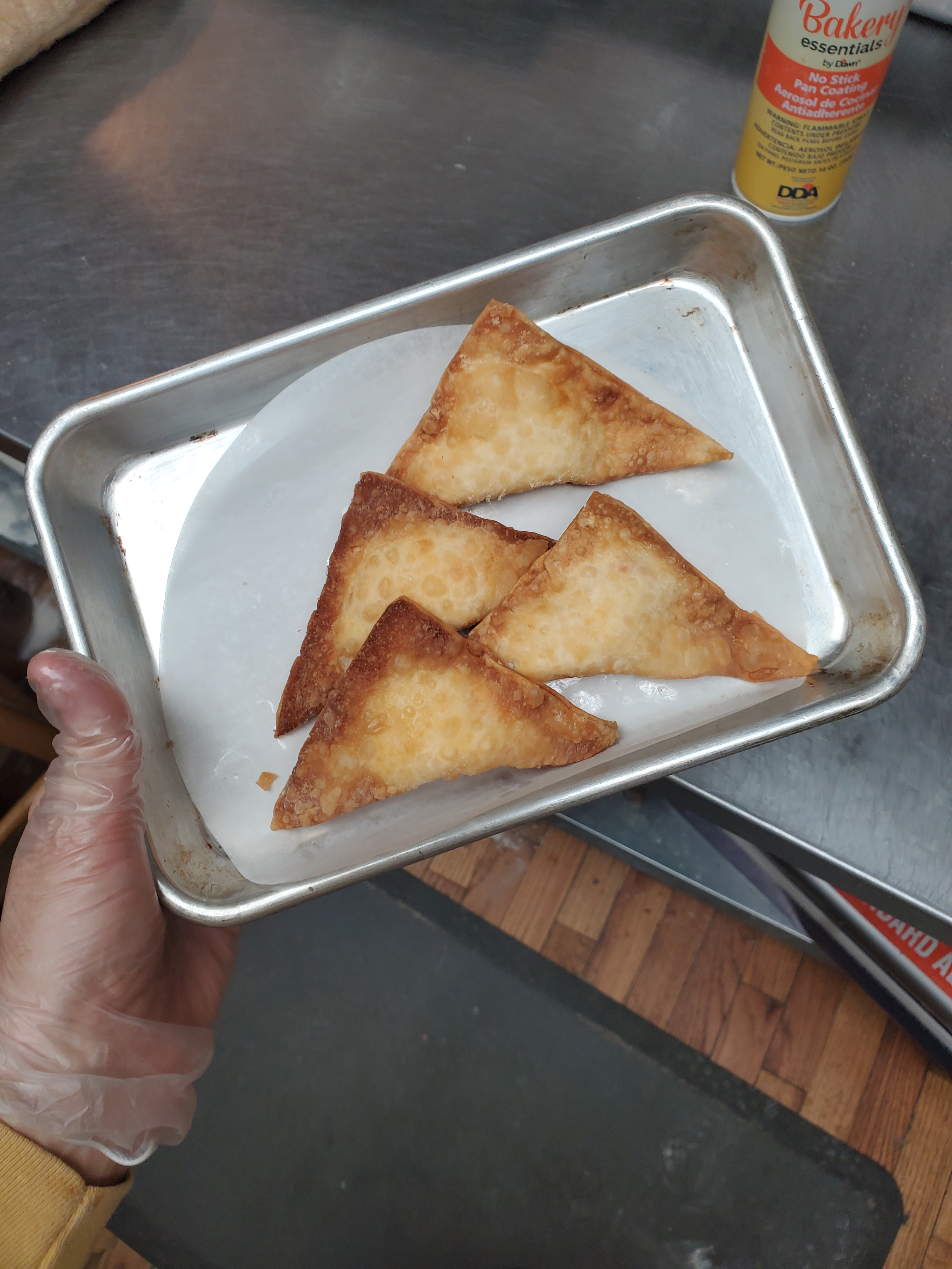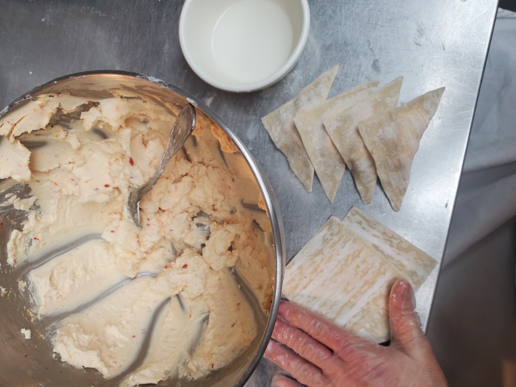 Our lunch special today was Asian Orange Chicken with roasted broccoli, steamed rice, and crab Rangoon, sans the crab. So we just call it Homestead Rangoon. And that’s the part of the special that I was in charge of. ✔